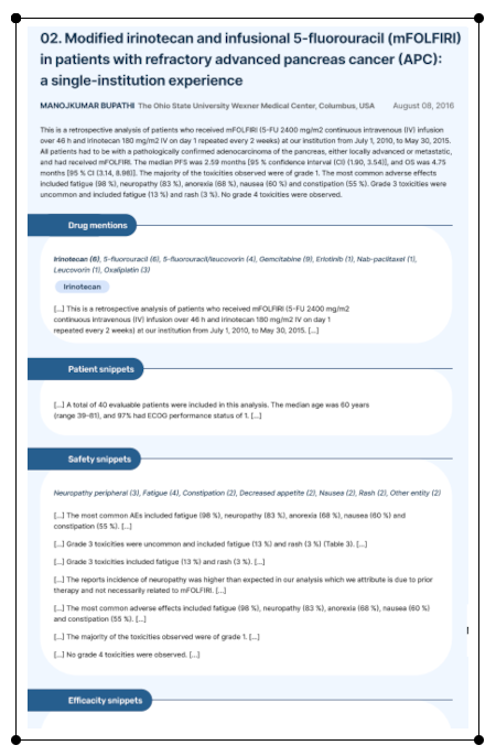 AI-powered Summarization: Get to know a unique pre-reading PV AI building concise summaries of relevant publications with extracts, highlighting key safety and efficacy insights.